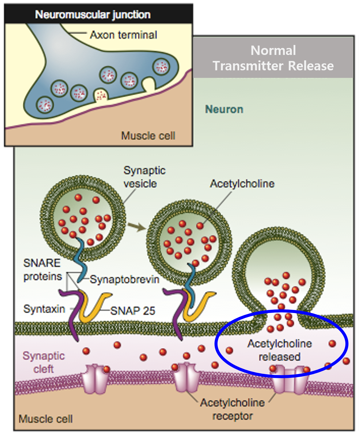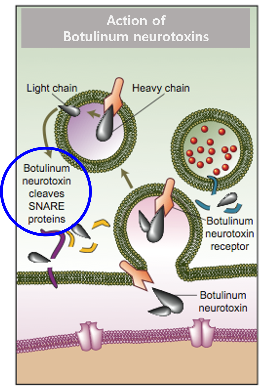 Botulinum toxin cleaves SNARE complex and inhibits the release of acetylcholine.